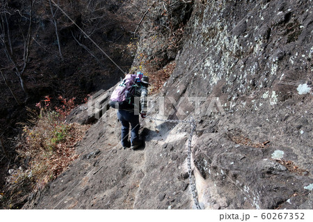 妙義山の第二石門にあるカニの横ばいを行く女性登山者