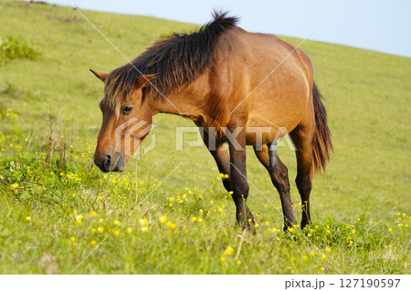 都井岬に生息する天然記念物の御崎馬が放牧地で草を食べる様子|馬イメージ|宮崎県串間市