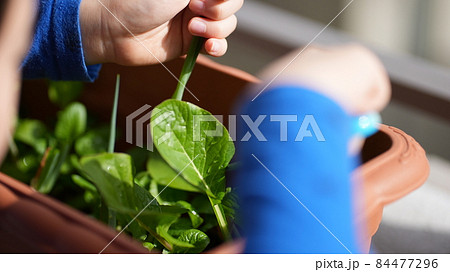 家庭菜園で育った小松菜を収穫する子どもの洋服と両手