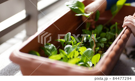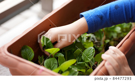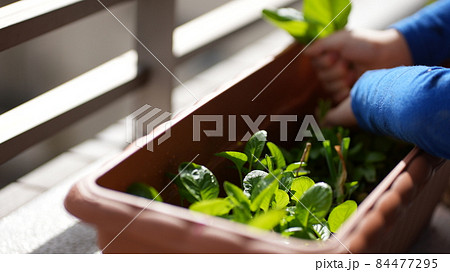 家庭菜園で育った小松菜を収穫する子どもの洋服と両手