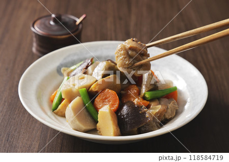 野菜の煮物、たけのこ、菜の花、レンコン、椎茸、ニンジン、ごぼう、大根、蒟蒻、がんもどき、煮しめ。