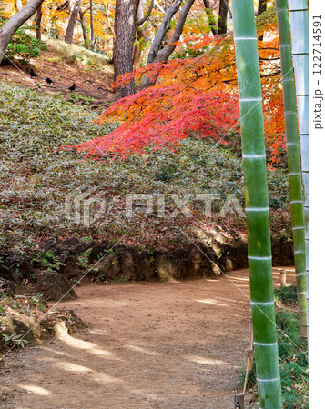 日本の美しい秋の景色 青々した竹林と鮮やかな紅葉