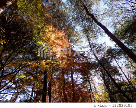 鮮やかな紅葉に彩られた晩秋の美しい林間の景色