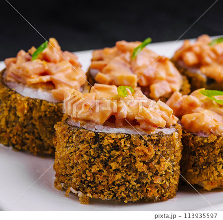 Delicious warm sushi roll with tuna, salmon, shrimp, cucumber and cream cheese