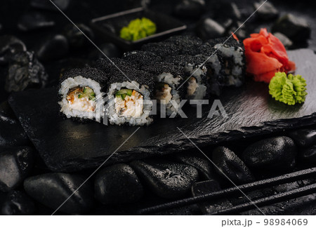 Traditional delicious freshsushi rolls with shrimp on a black background. Sushi roll with rice, cream cheese, avocado, salmon, sesame. Sushi menu. Japanese kitchen, restaurant