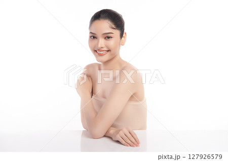 A beautiful young Asian woman with clean, fresh skin against a white background. Skincare, facial treatment, cosmetology, beauty, and spa. An elegant portrait of an Asian woman.