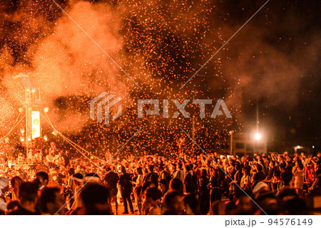 火の粉舞う中を熱狂するあばれ祭