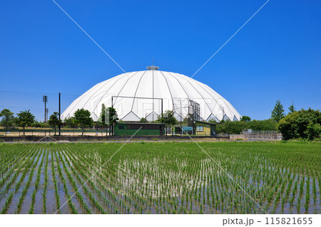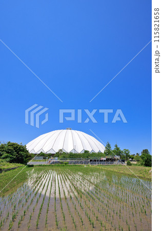 〈島根県〉6月の出雲ドーム 田んぼに映る出雲ドーム
