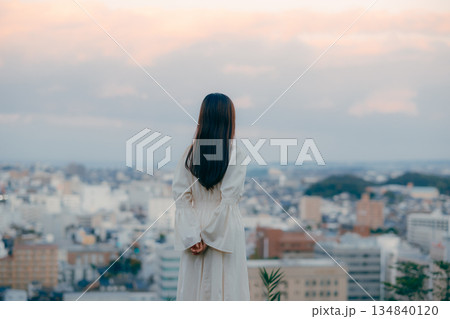 街並みを背景に佇む日本人女性