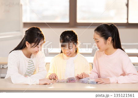 放課後に小学生の女の子がシール帳を使ってシール交換を楽しむ様子