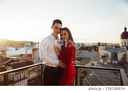 Couple stands together on rooftop during sunset overlooking city skyline