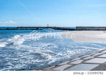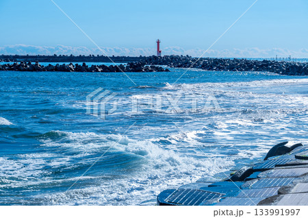 茨城県日立市・河原子海岸の赤い灯台と白波が美しい海の風景