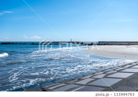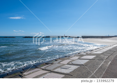日立市・河原子海岸の砂浜と防波堤、赤灯台を望む太平洋の景観