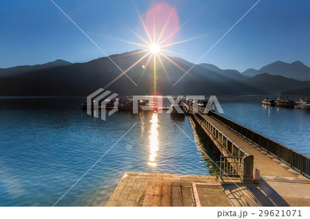 天際線上的太陽升起,美麗晨彩也反射在水面上。