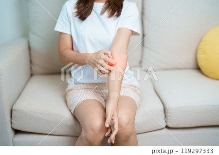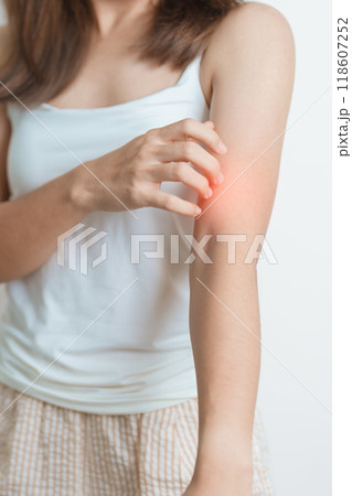 Elderly woman itching arm and body scratching for Skin Allergy from insect bite and food dermatitis. Dermatology, Leprosy day, Systemic lupus erythematosus, Psoriasis, Urticaria and rash Eczema