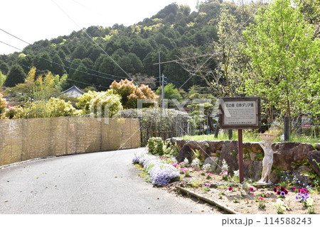 滋賀県蒲生郡 日野ダリア園案内板と正法寺山と新緑