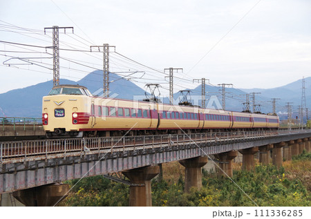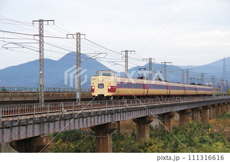 日野川の長い鉄道橋梁を駆け抜ける復刻版旧国鉄色の381系特急やくも号