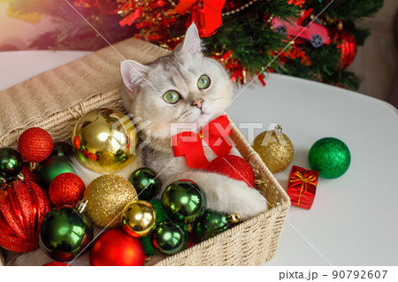 A beautiful white cat lies in a wicker basket near a Christmas tree, in multi-colored Christmas balls