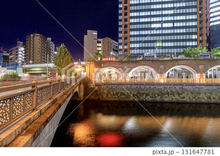 日本の東京都市景観 万世橋やマーチエキュート、神田川、電車などを望む・夜景(右奥は御茶ノ水駅方向)