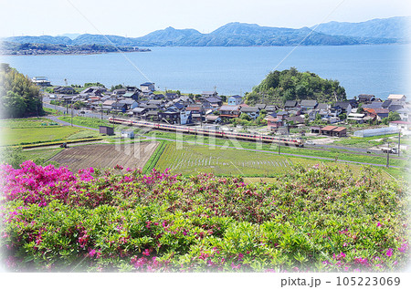 国鉄色の特急やくも号が走る中海沿線の風景(イラスト風)