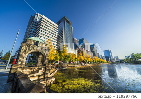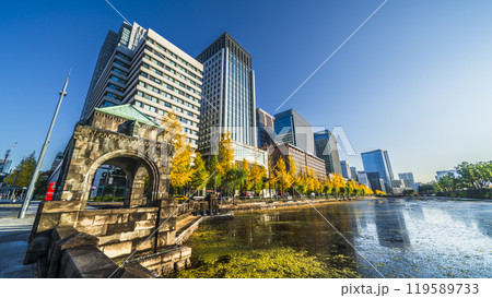 お濠に鮮やかに写り込む和田倉門近くのイチョウ並木道