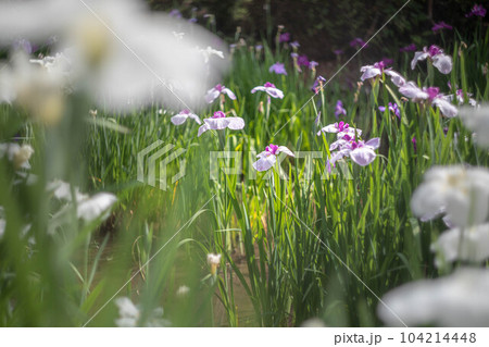 梅宮大社、池の畔に咲くカキツバタと「あしのまろや」池中亭