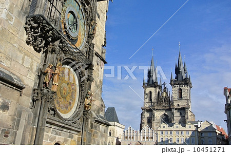 プラハ旧市庁舎の天文時計とティーン教会(チェコ共和国)