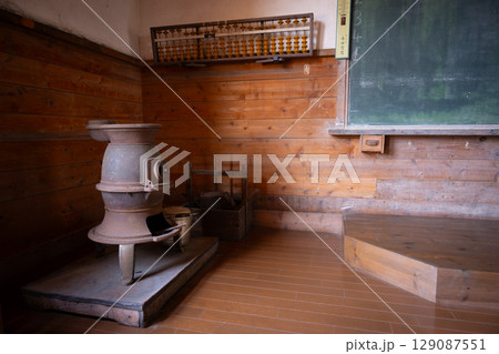 昭和の時代の小学校 教室のダルマストーブと大きなそろばん