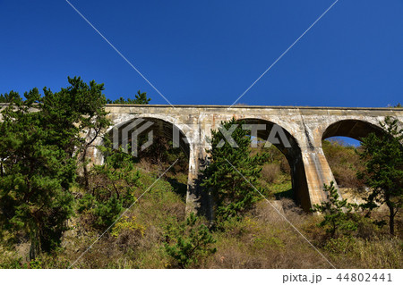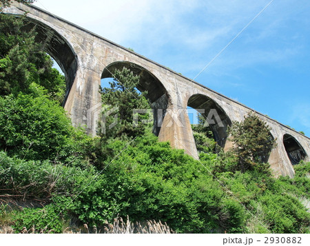 快晴の北海道函館市汐首岬にある旧戸井線のアーチ橋の風景を撮影