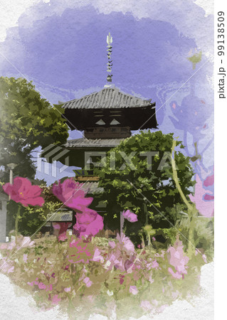水彩画風 法起寺 境内 奈良県生駒郡斑鳩町