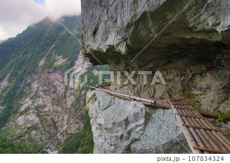 黒部渓谷下ノ廊下の断崖絶壁の水平歩道の写真