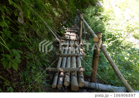 山道の丸太の山道夏の黒部峡谷下ノ廊下(旧道電歩道