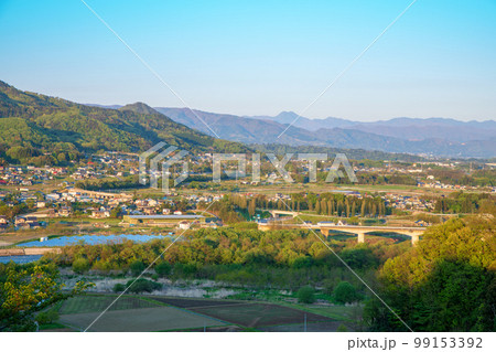 名胡桃城址からの眺め 旧月夜野町・三峰山方面 春の風景 群馬県みなかみ町