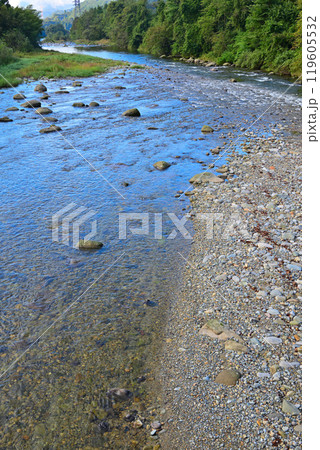 静かに流れる早朝の利根川 小松発電付近の風景 みなかみ町