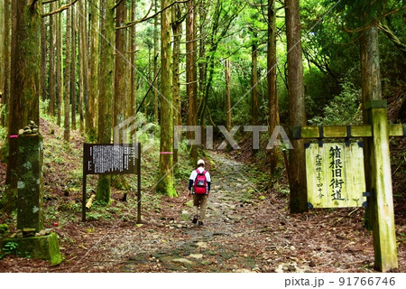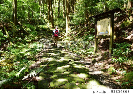 箱根町 箱根旧街道(旧東海道)案内板と石畳とハイカー