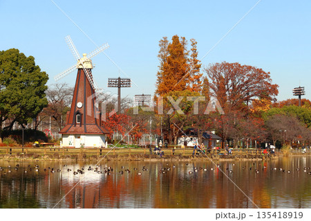 秋の都立浮間公園:浮間ヶ池と風車(東京都北区/板橋区)