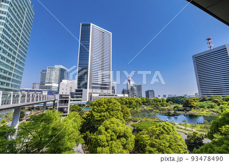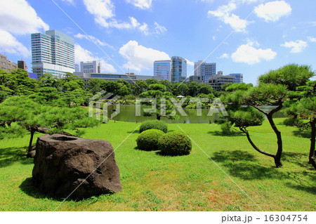 東京 港区 旧芝離宮恩賜庭園から見た汐留ビルディング