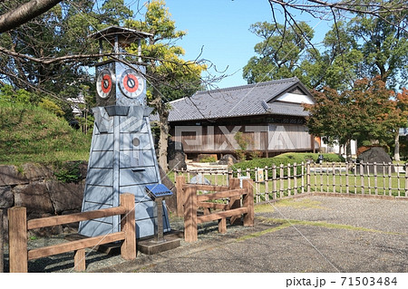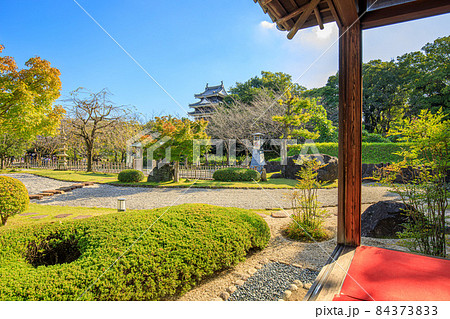 西尾市 西尾市歴史公園内、旧近衛邸より眺めた石庭と西尾城本丸丑寅櫓