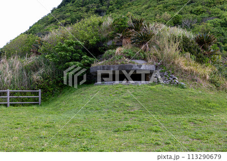 愛媛県・佐田岬半島に残る、防空監視哨の聴音壕跡。青空の下、丘の上に静かに佇む歴史遺構。