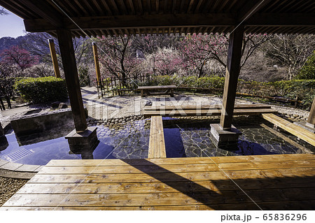 静岡県熱海市 熱海梅園 和風庭園の足湯 早咲きの梅
