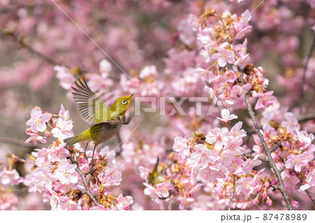 河津桜の中で春到来の喜びをあげるメジロをとらえた一枚
