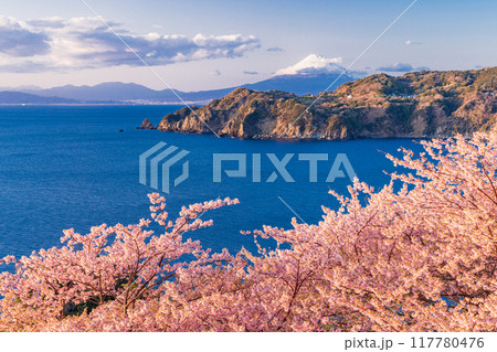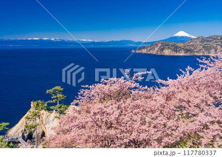 (静岡県)西伊豆黄金崎 早咲き桜の向こうに富士山 午後