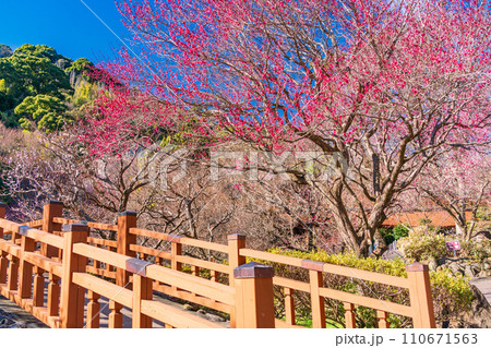 静岡県熱海市 熱海梅園 迎月橋(げいげつばし)と梅林 早咲きの梅