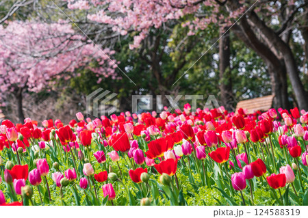 春のなばなの里、満開のチューリップと河津桜〈三重県桑名市〉