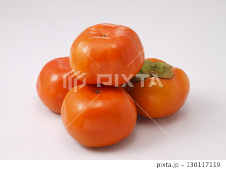 晩秋の候、澄んだ青空を背景にして、熟れた柿の実がなっている。