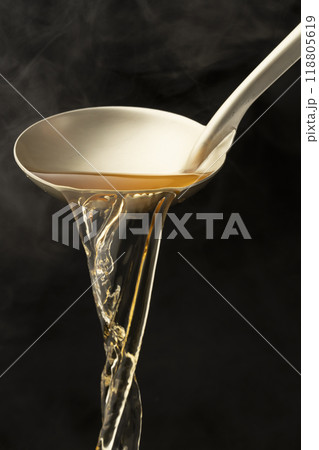 出汁 お玉で温かい出汁を掬う