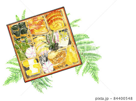裏白を敷いたお重に詰めたお節 (おせち)素材【水彩イラスト】白バック コピースペースあり透過背景