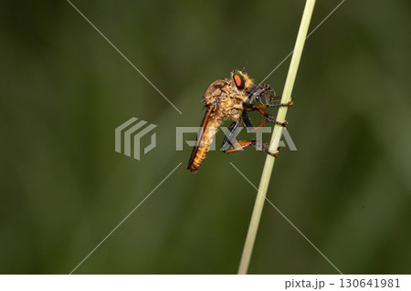 小さな羽虫を捕食しているアオメアブ ムシヒキアブの仲間