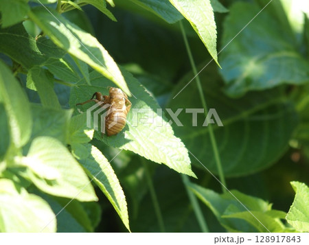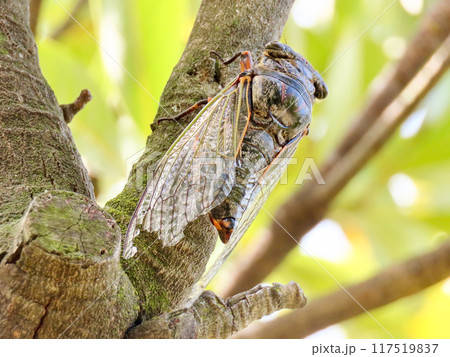 初夏緑の葉生い茂る桜の木にとまるアブラゼミ