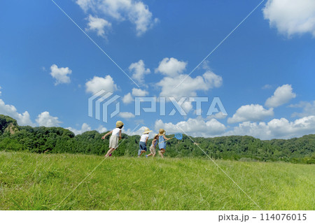 夏の草地で遊ぶ子供たちの後ろ姿